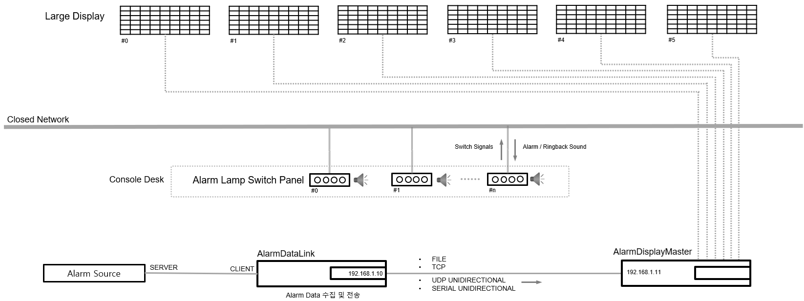- AlarmDisplayMaster: AlarmDataLink로 부터 수신된 경보 신호를 각 대형 화면에 전송